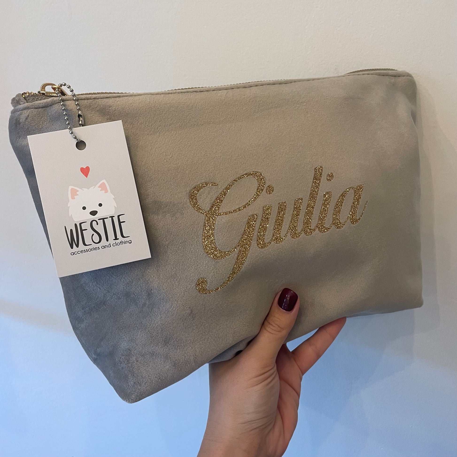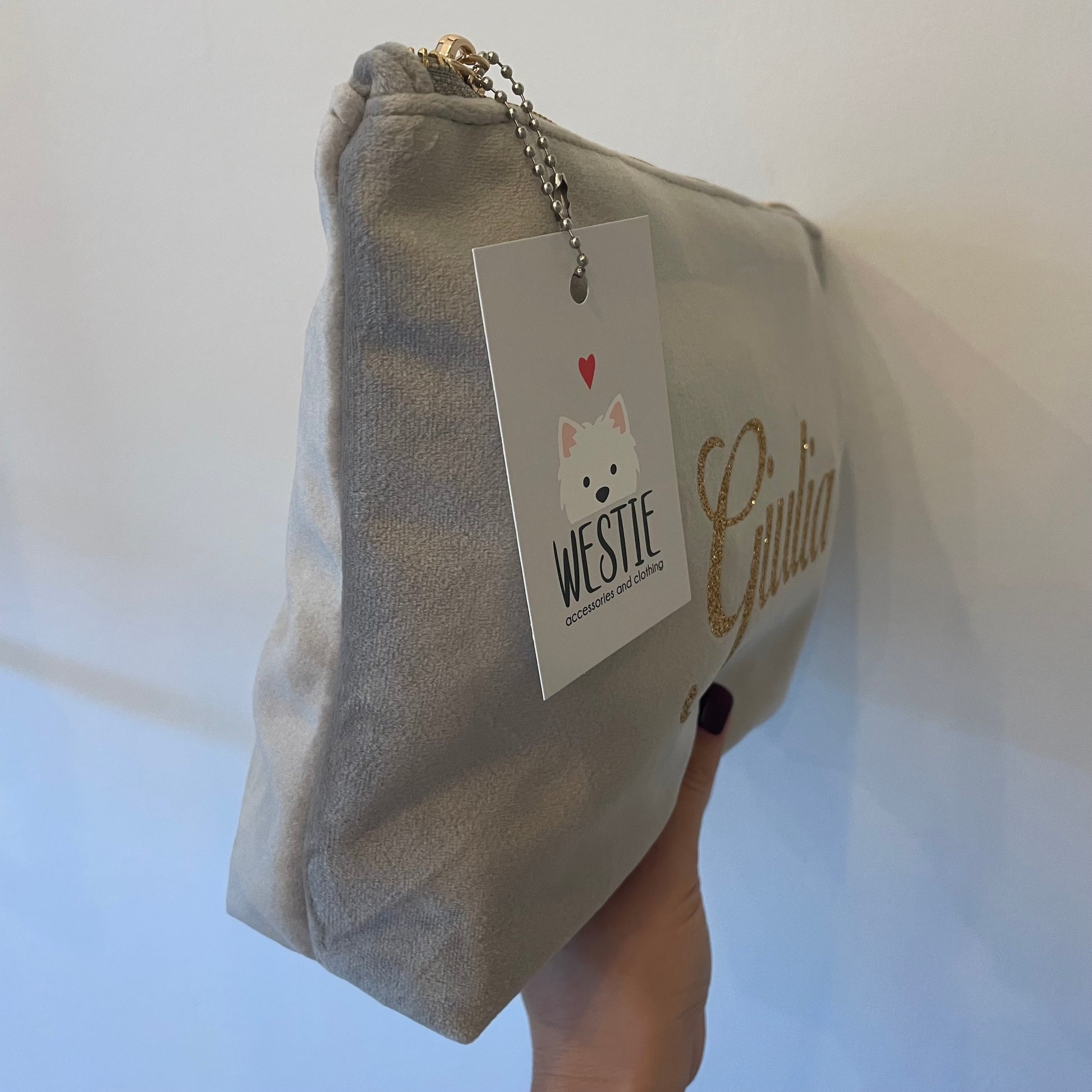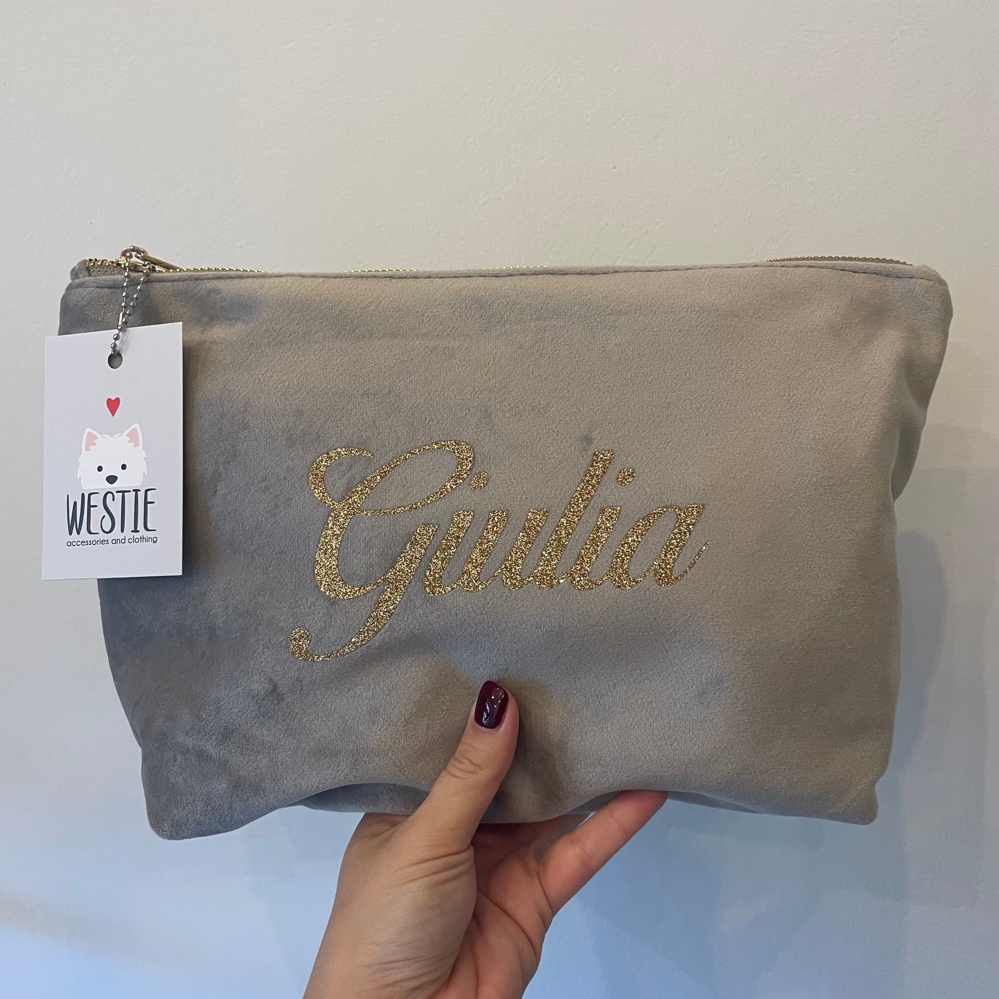Dimensioni: (23x24) cm. Cerniera in metallo dorato, personalizzazione in termo-vinile.