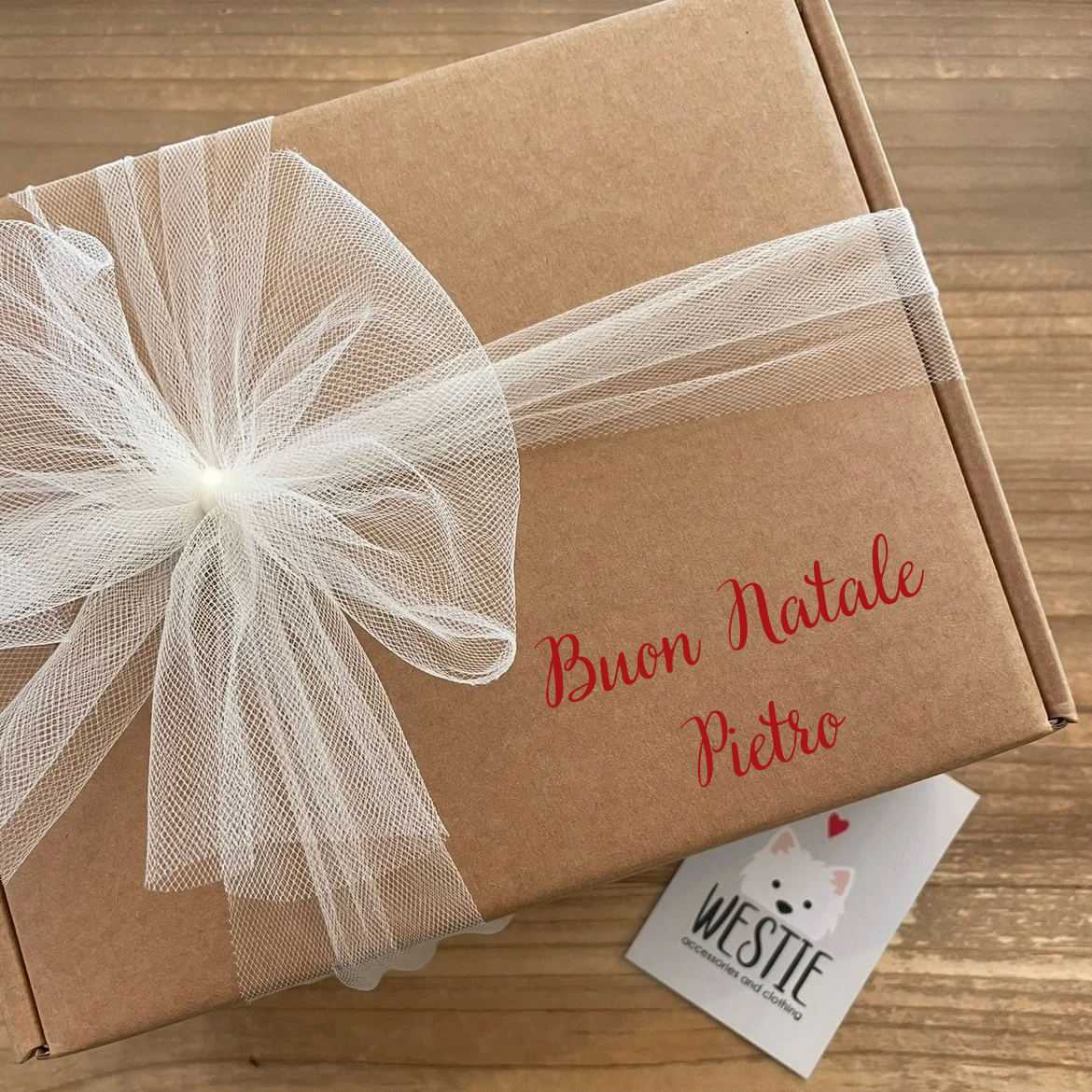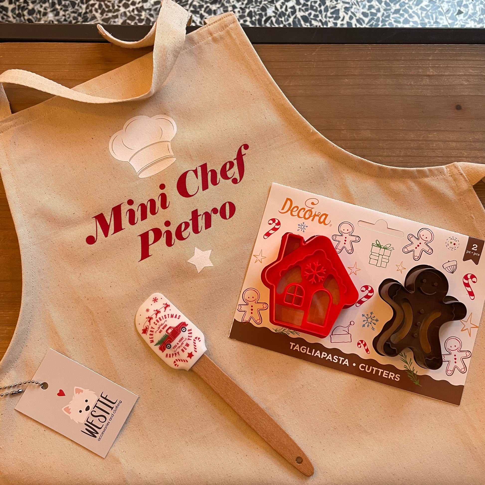 Scatola personalizzata con all’interno grembiule bimbo, stampini natalizi e mini marisa