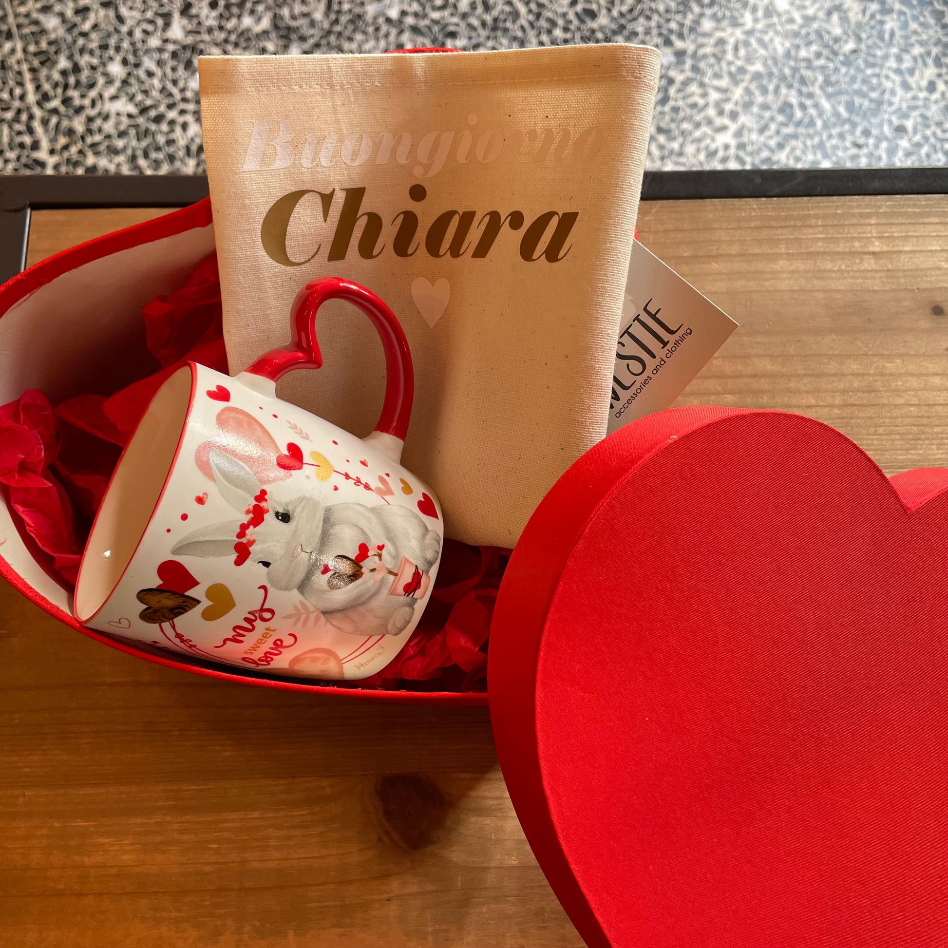 Scatola a forma di cuore con all’interno una tovaglietta personalizzata e una tazza San Valentino