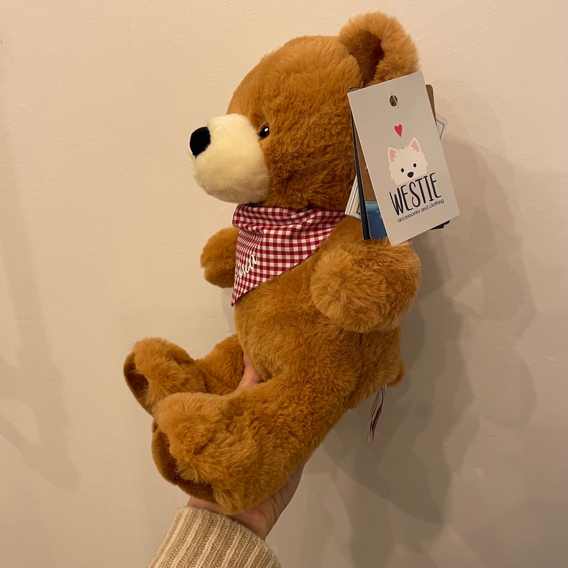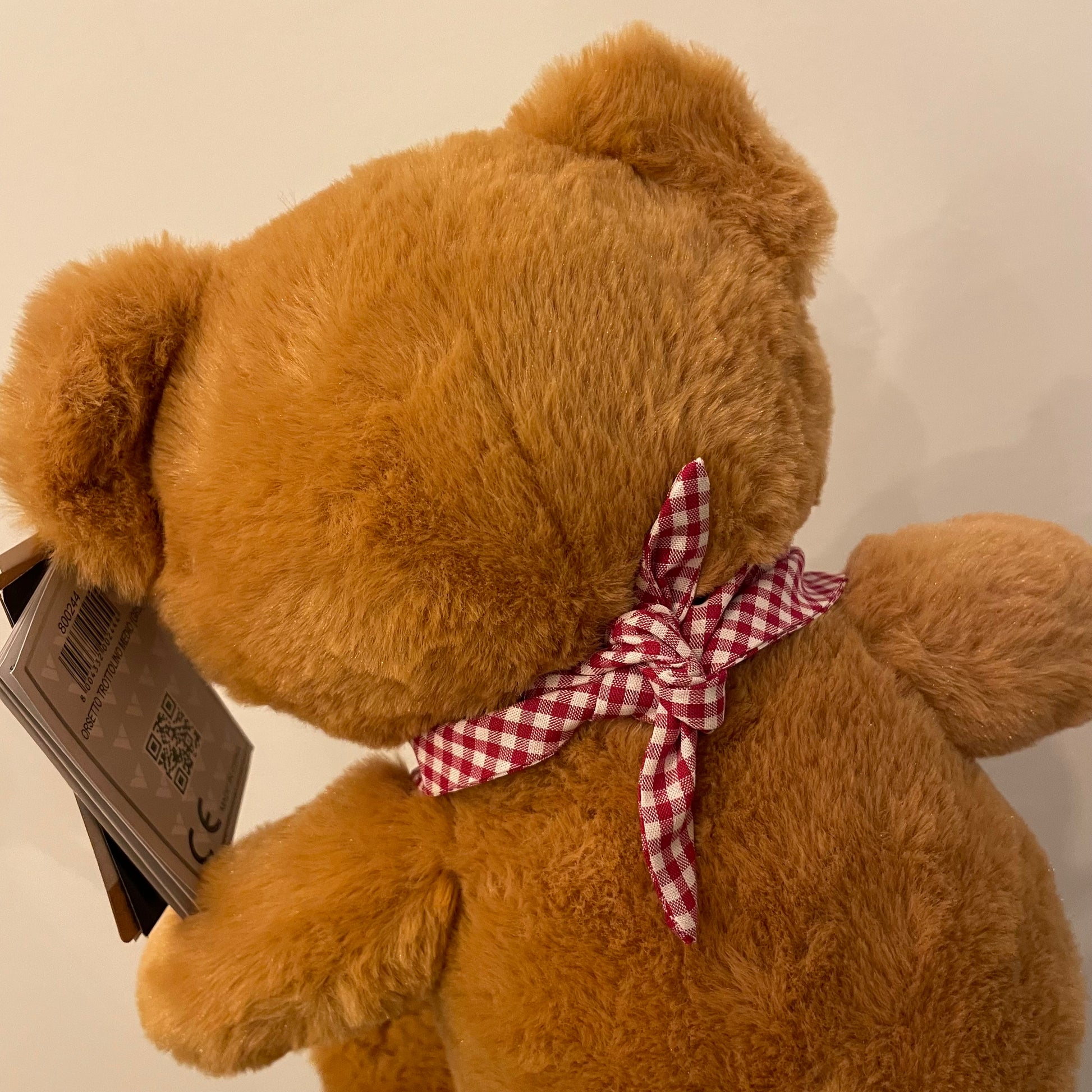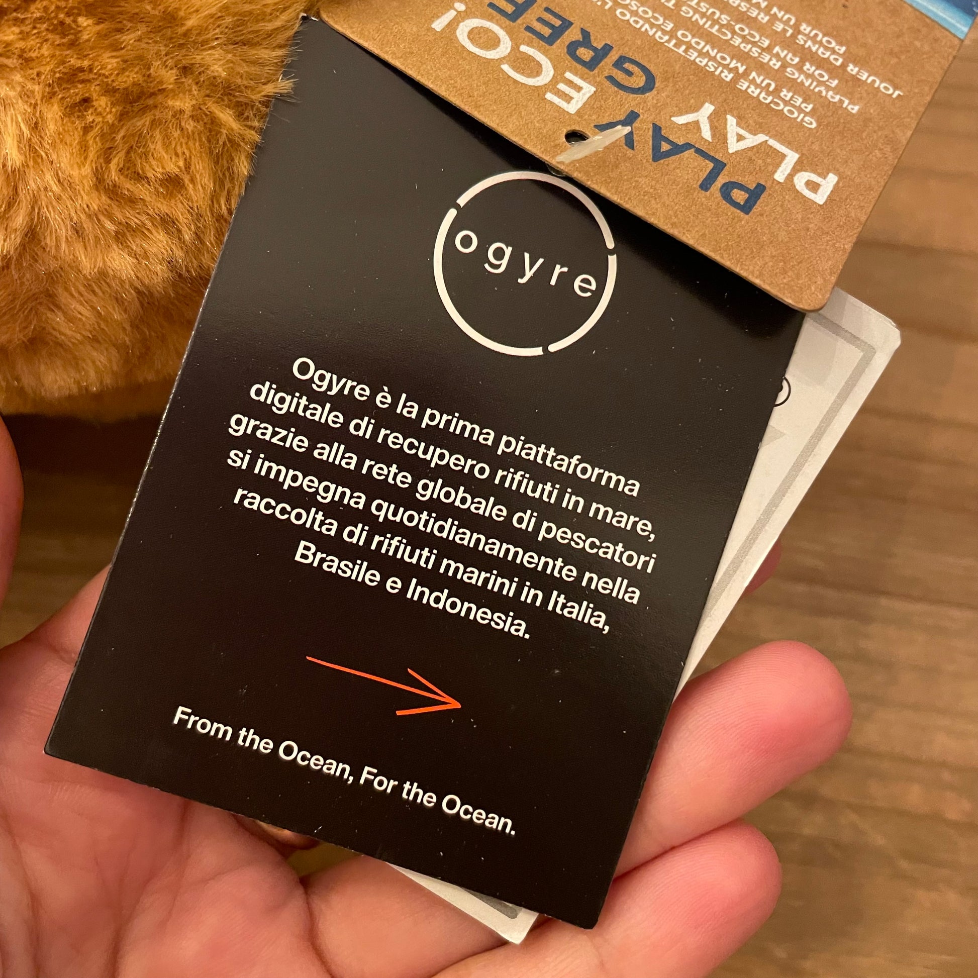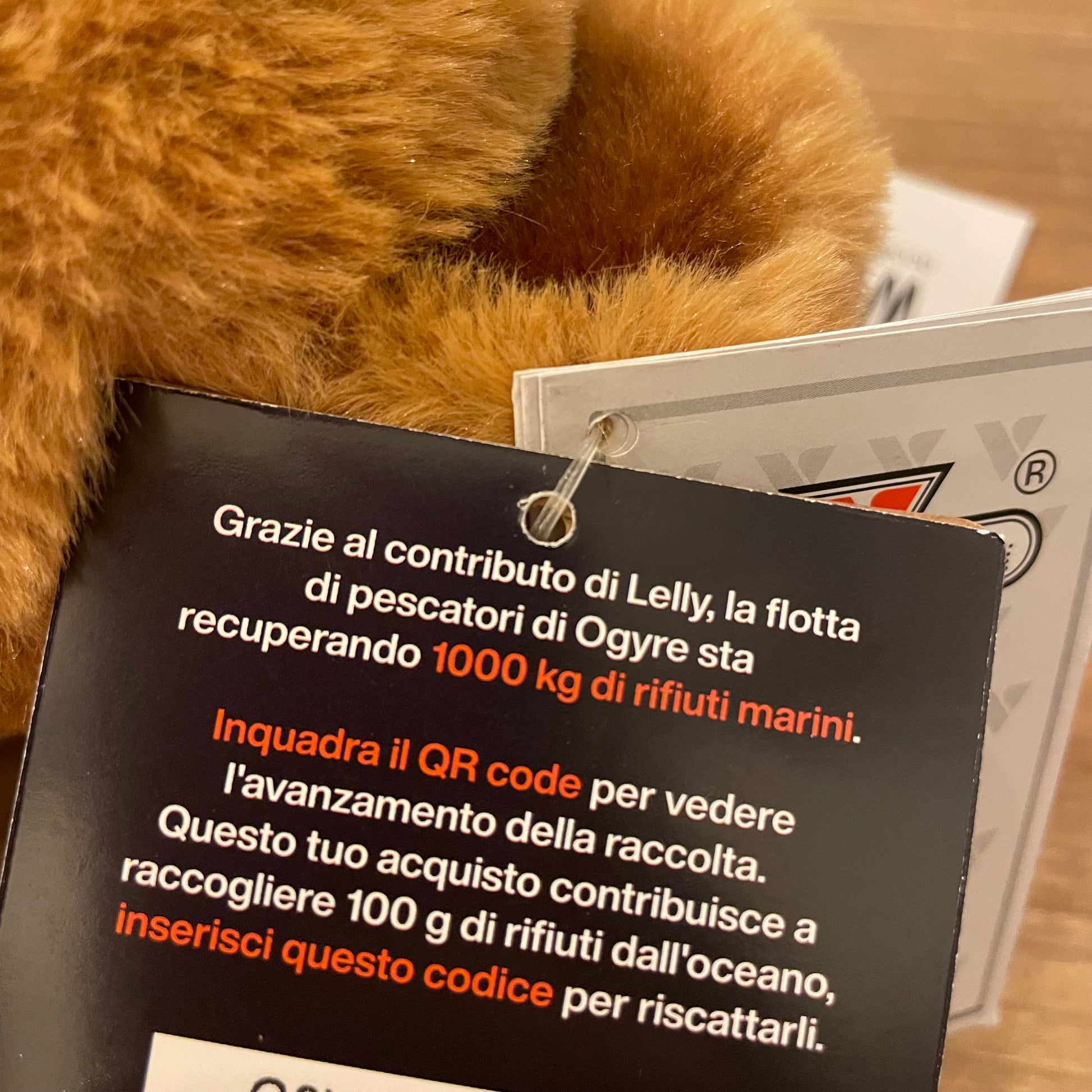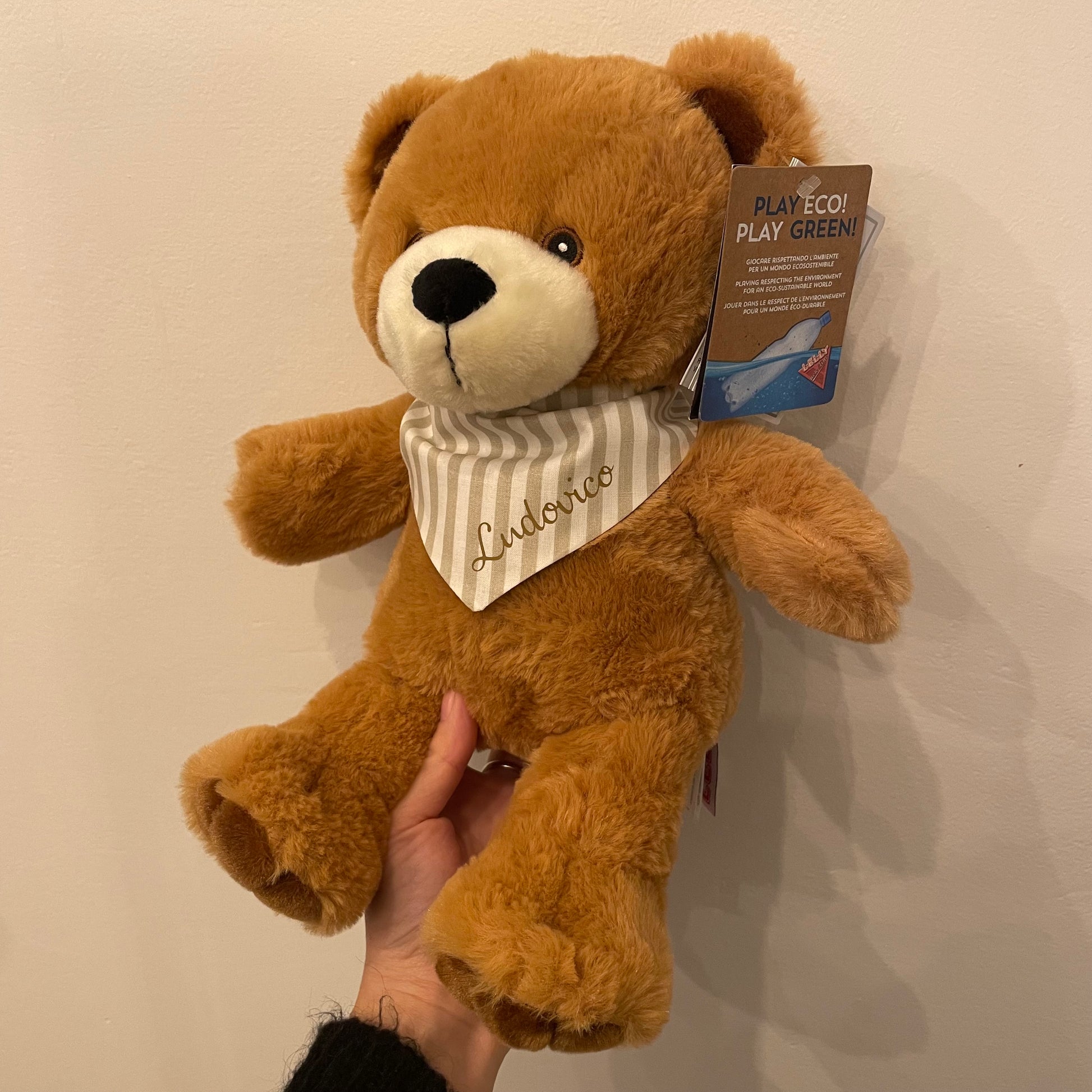 Dolcissimo e morbidissimo teddy con bandana personalizzata. Dimensioni: 34 cm. Realizzato rispettando l’ambiente, con poliestere riciclato. Il suo acquisto ha contribuito alla raccolta dei rifiuti nell’oceano. La personalizzazione è realizzata in termo-vinile.