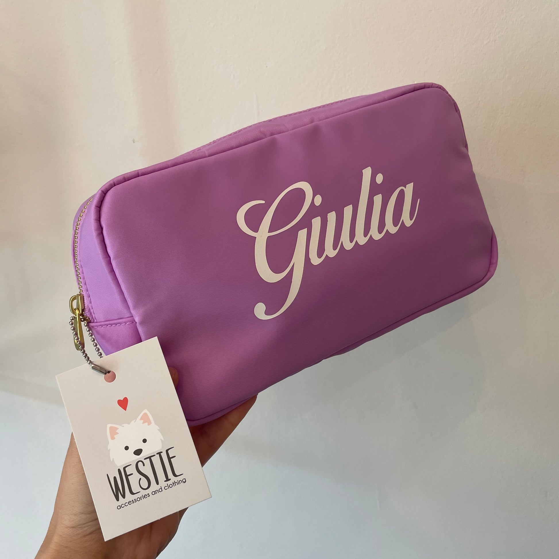 Dimensioni: (25,5x7x14) cm. Questo modello presenta la zip dorata in tutte le varianti. La personalizzazione è realizzata in termo-vinile.