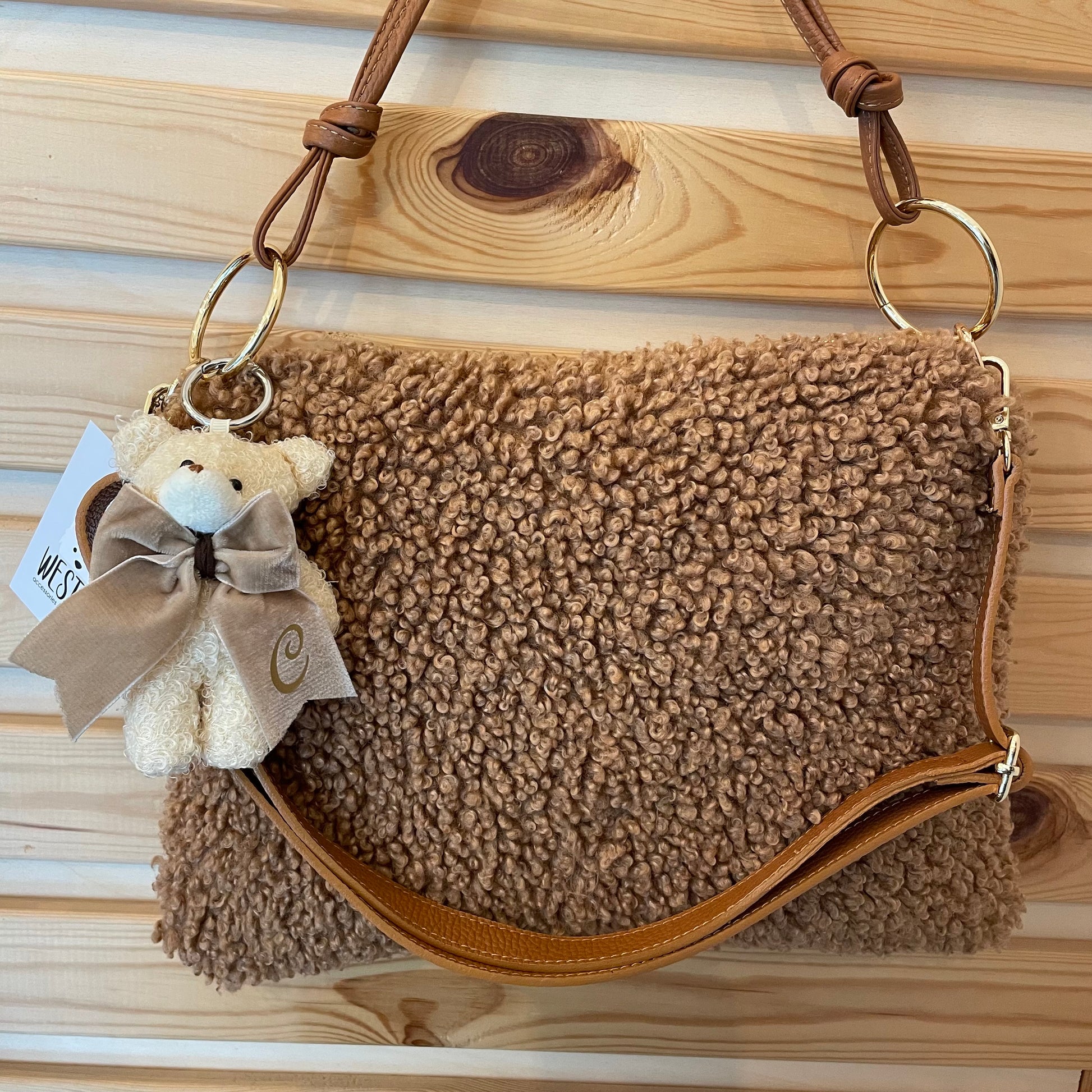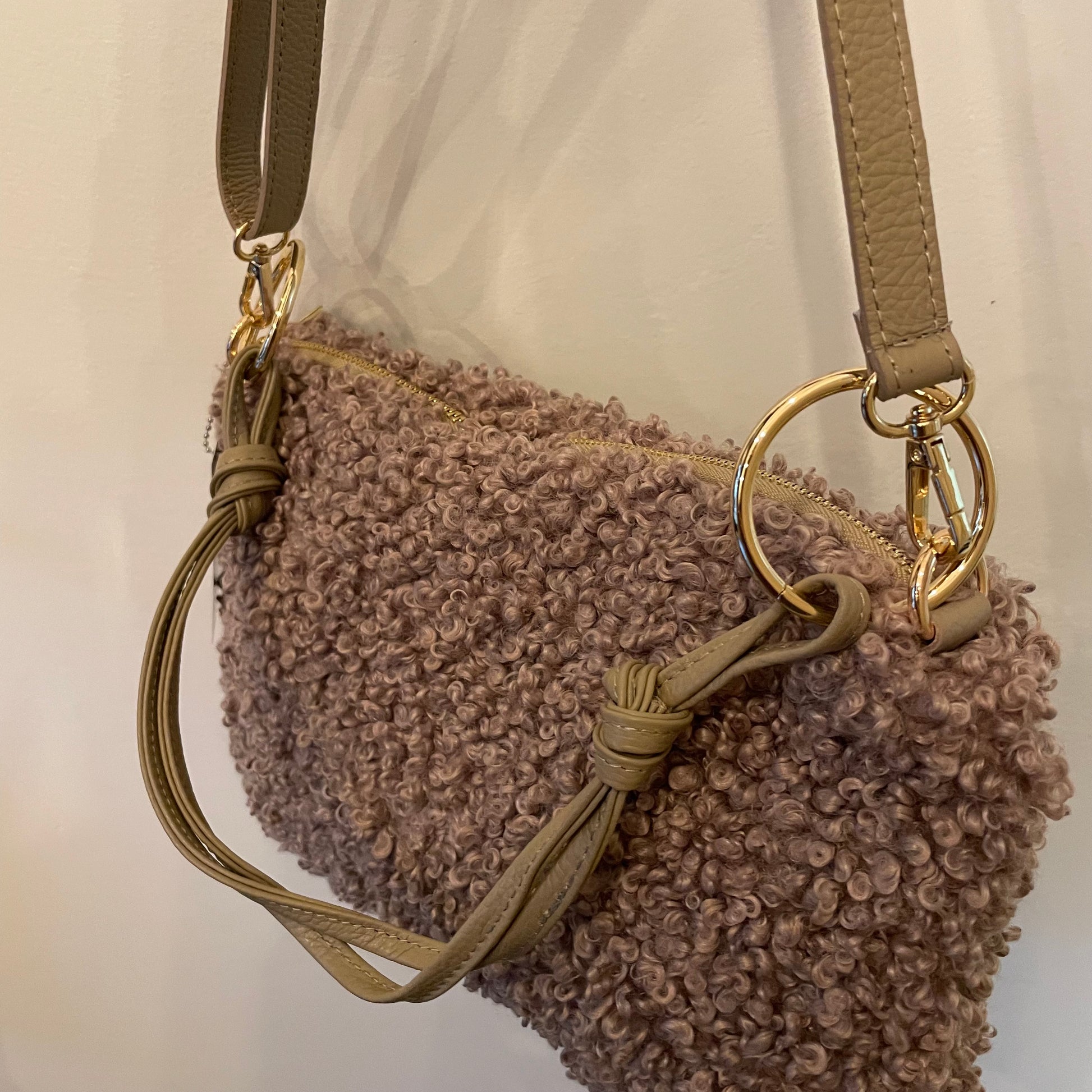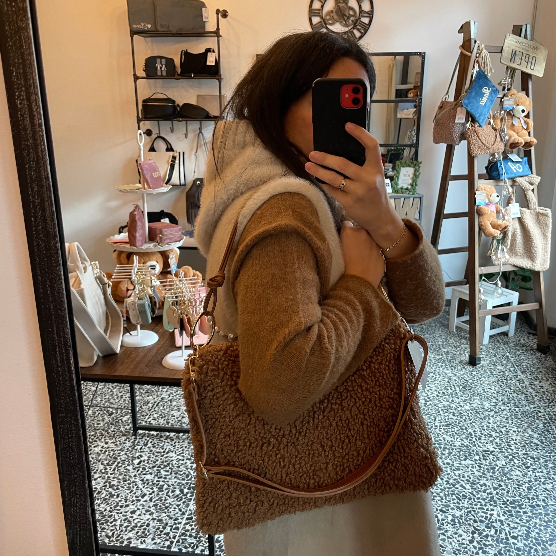 Borsa in teddy made in Italy con manico e tracolla staccabile in vera pelle.
