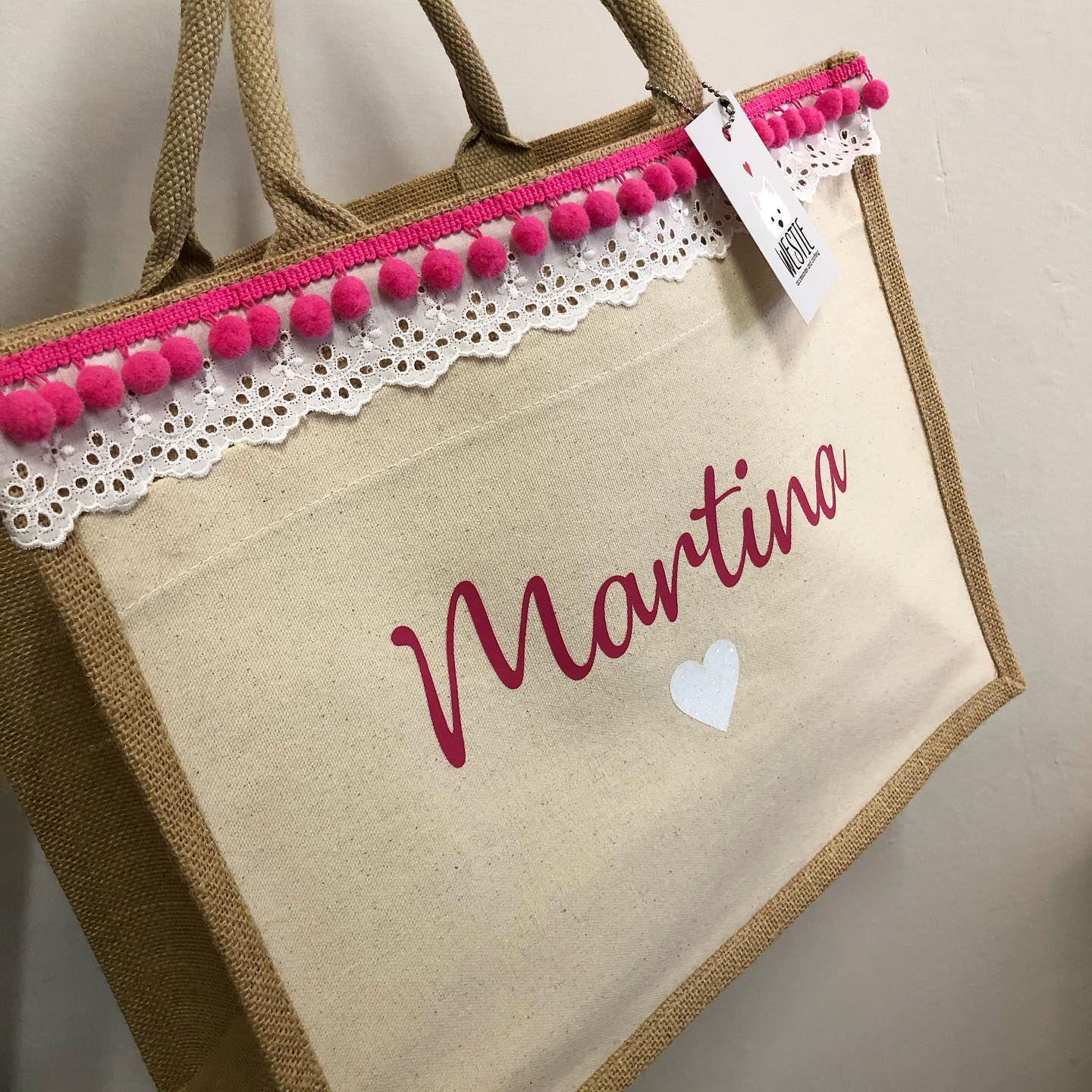 Dimensioni: (42x33) cm. Questo modello non presenta chiusure ed ha una tasca davanti in cotone. La decorazione è realizzata con pizzo san gallo e pompon. La personalizzazione è realizzata in termo-vinile.