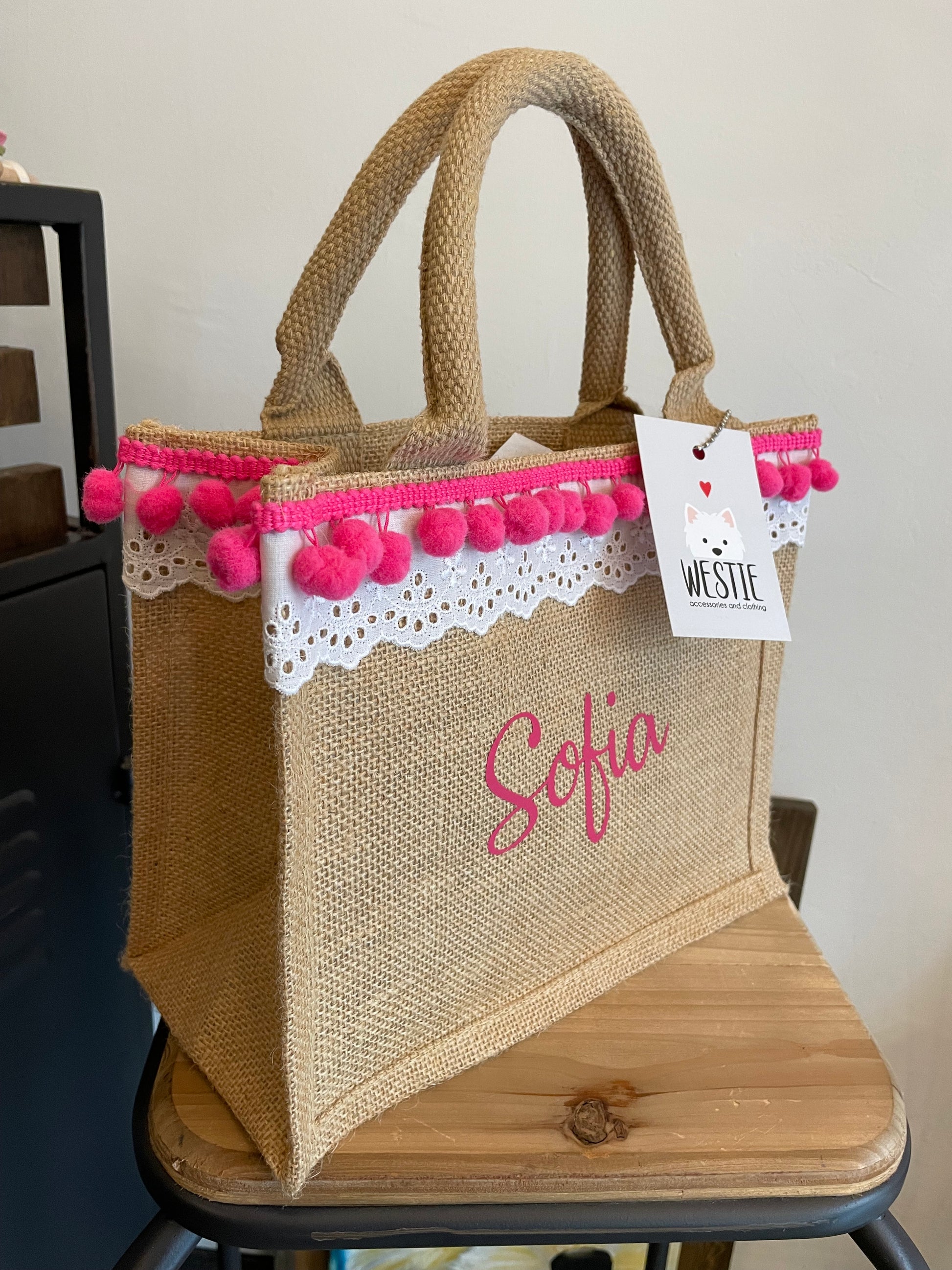 Dimensioni: (26x21). Questo modello non presenta chiusure ed è possibile scegliere se averlo con tasca davanti in cotone oppure senza. La decorazione è realizzata con pizzo san gallo e pompon. La personalizzazione è realizzata in termo-vinile.