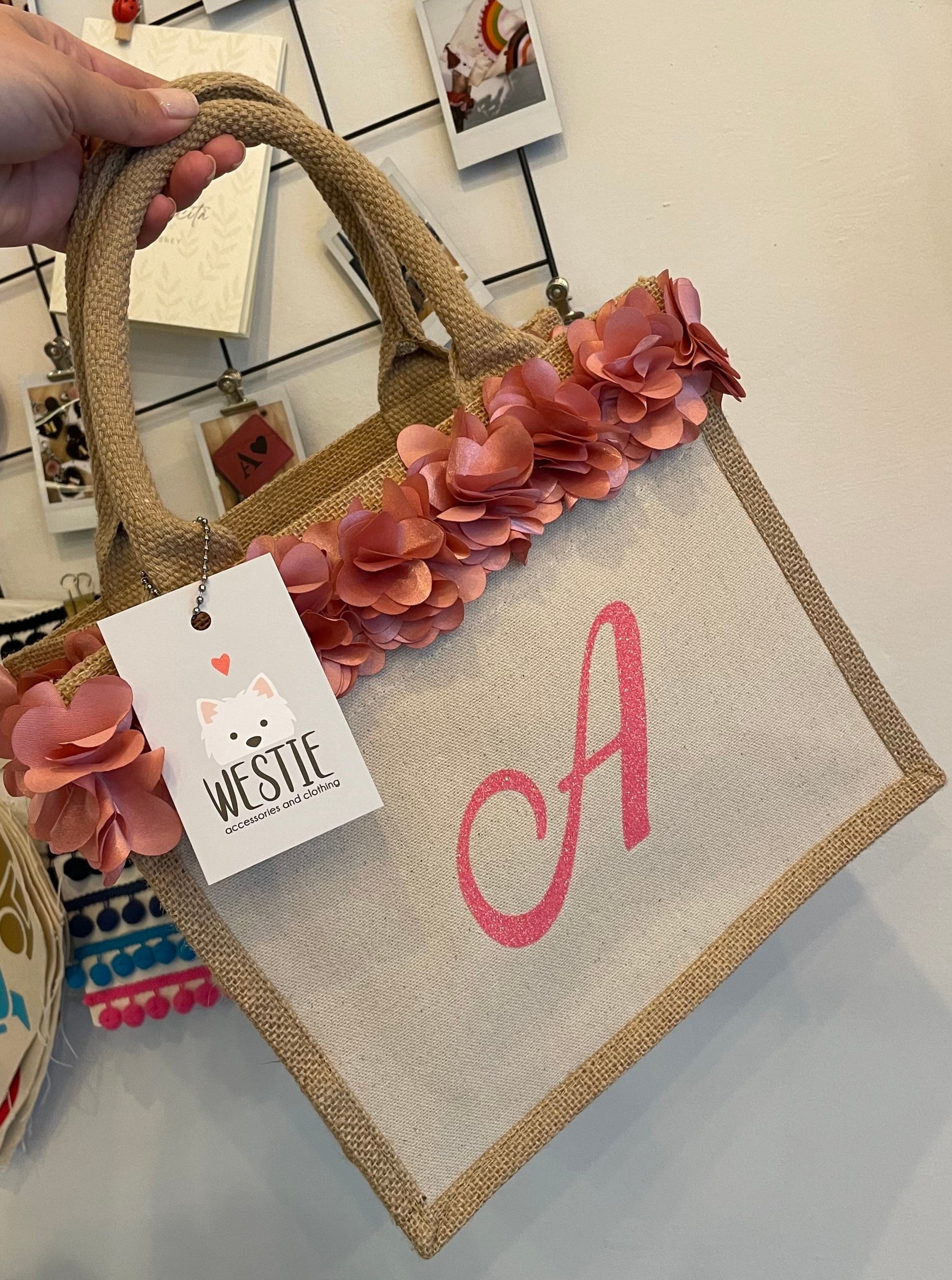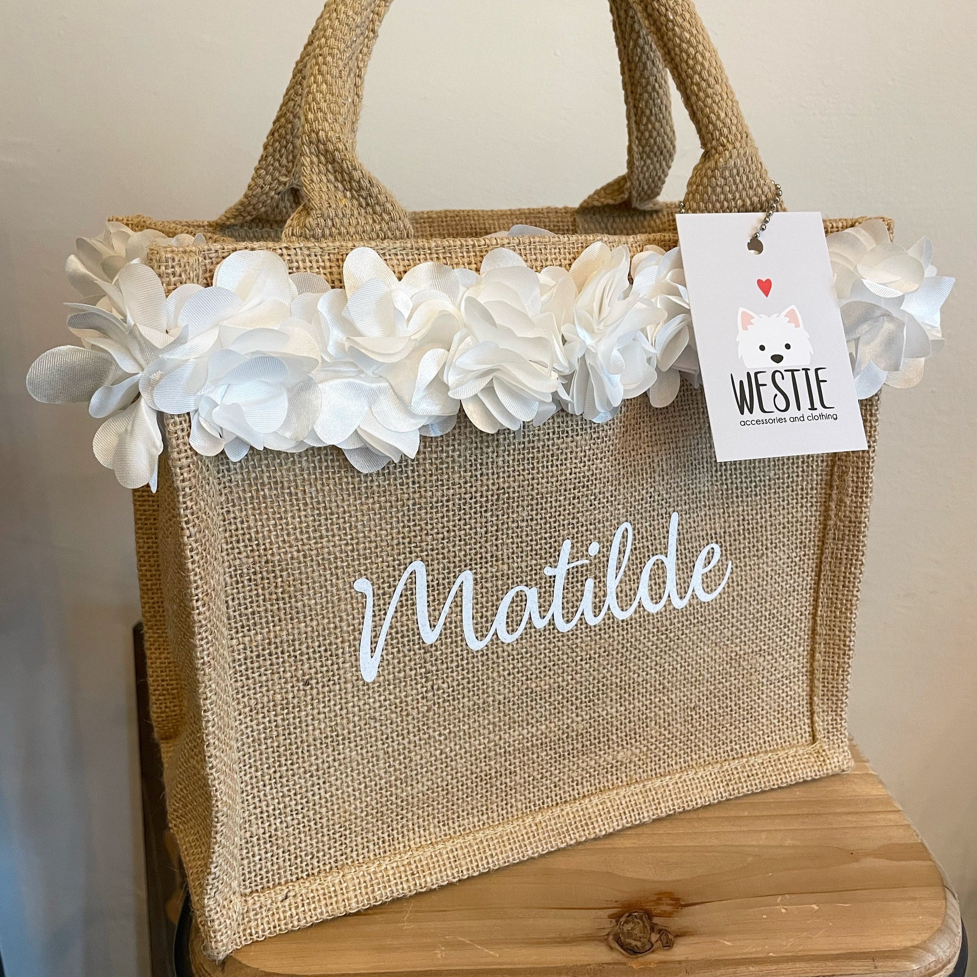 Dimensioni: (26x21). Questo modello non presenta chiusure ed è possibile scegliere se averlo con tasca davanti in cotone oppure senza. La decorazione è realizzata con fiori in organza. La personalizzazione è realizzata in termo-vinile.