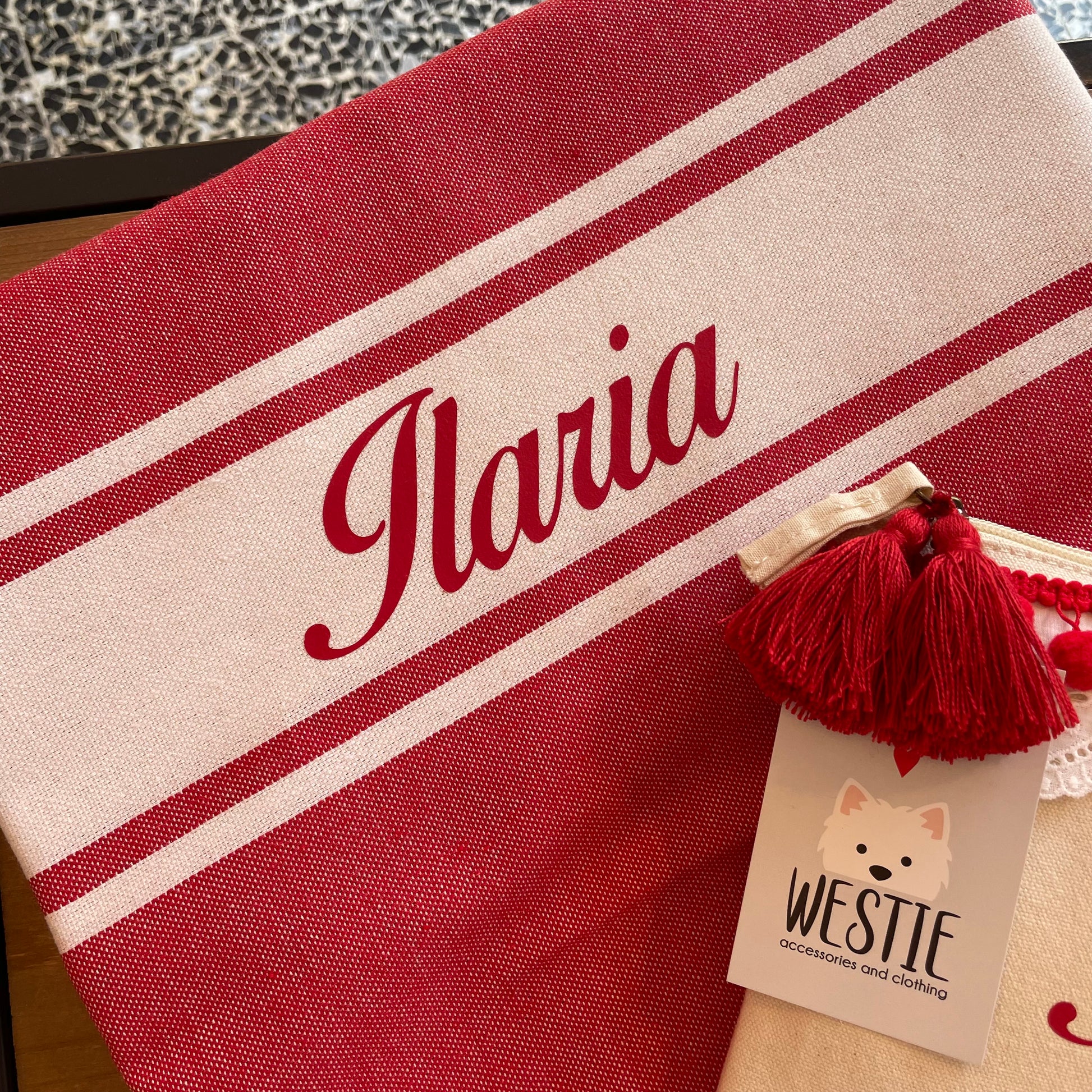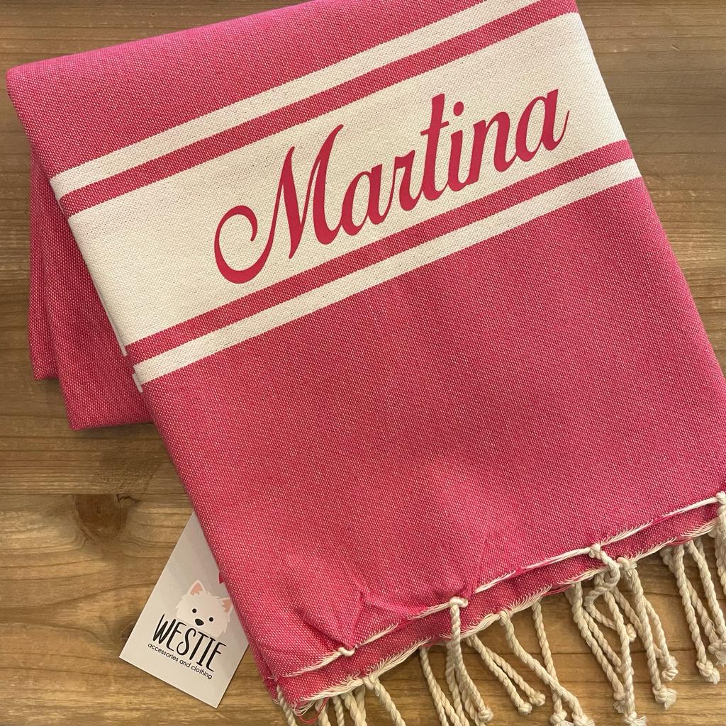 Dimensioni:(1x2) mt. Fouta 100% cotone riciclato, lavabile in lavatrice a 30 gradi (no asciugatrice). La personalizzazione è realizzata in termo-vinile.